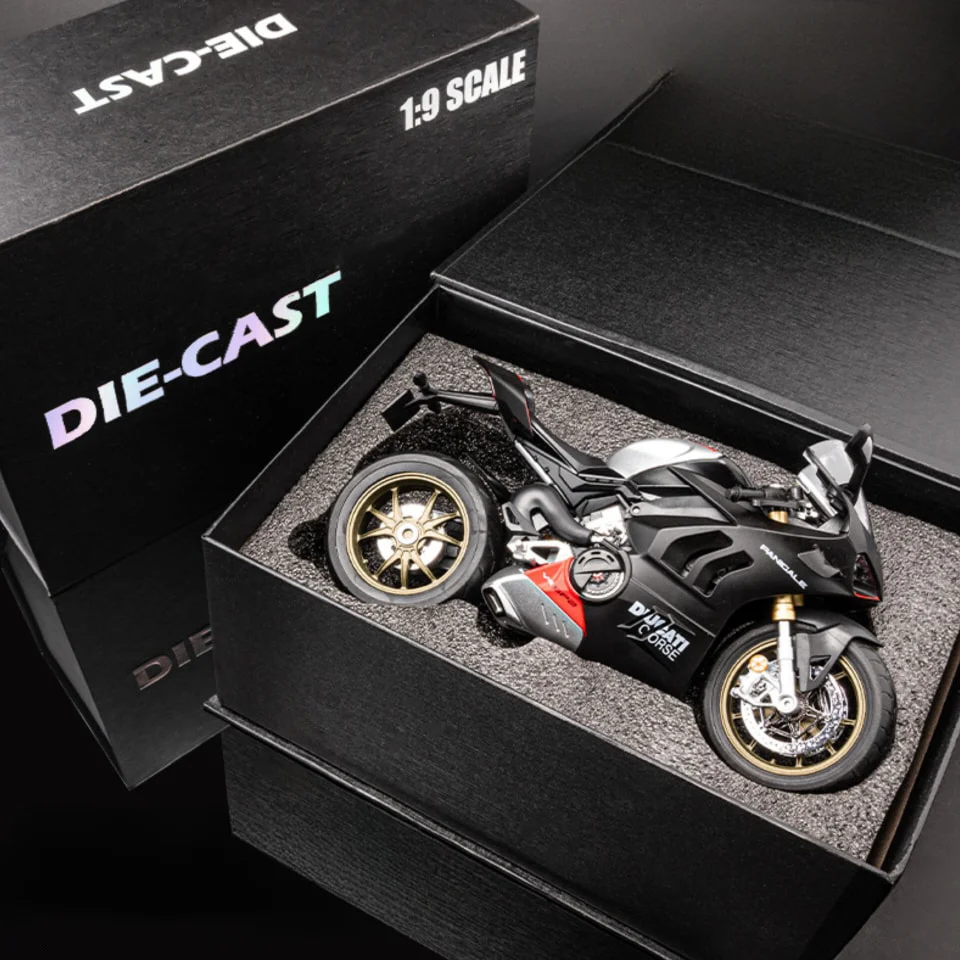 Scale and Dimensions: The motorcycle model is scaled to a large 1:9 scale, measuring 23.5 x 9.5 x 13 cm, fully showcasing the details of the Ducati V4 SP2. The high-end gift box measures 27.5 x 9 x 11.8 cm, making it convenient for collection and gift giving.
