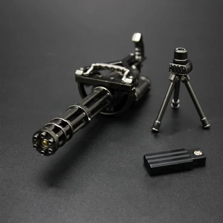 Included gun-metalcolour gatling diecast metal alloy gun model, with tripod stand and removable magazine, screw and screwdriver