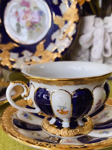 Very gorgeous and noble large coffee cup set, from German luxurious rococo style, the glaze color is combined with solemn royal blue color, the cup mouth is extended and the foot support is extended, and the edge of the plate is embossed with golden vines.