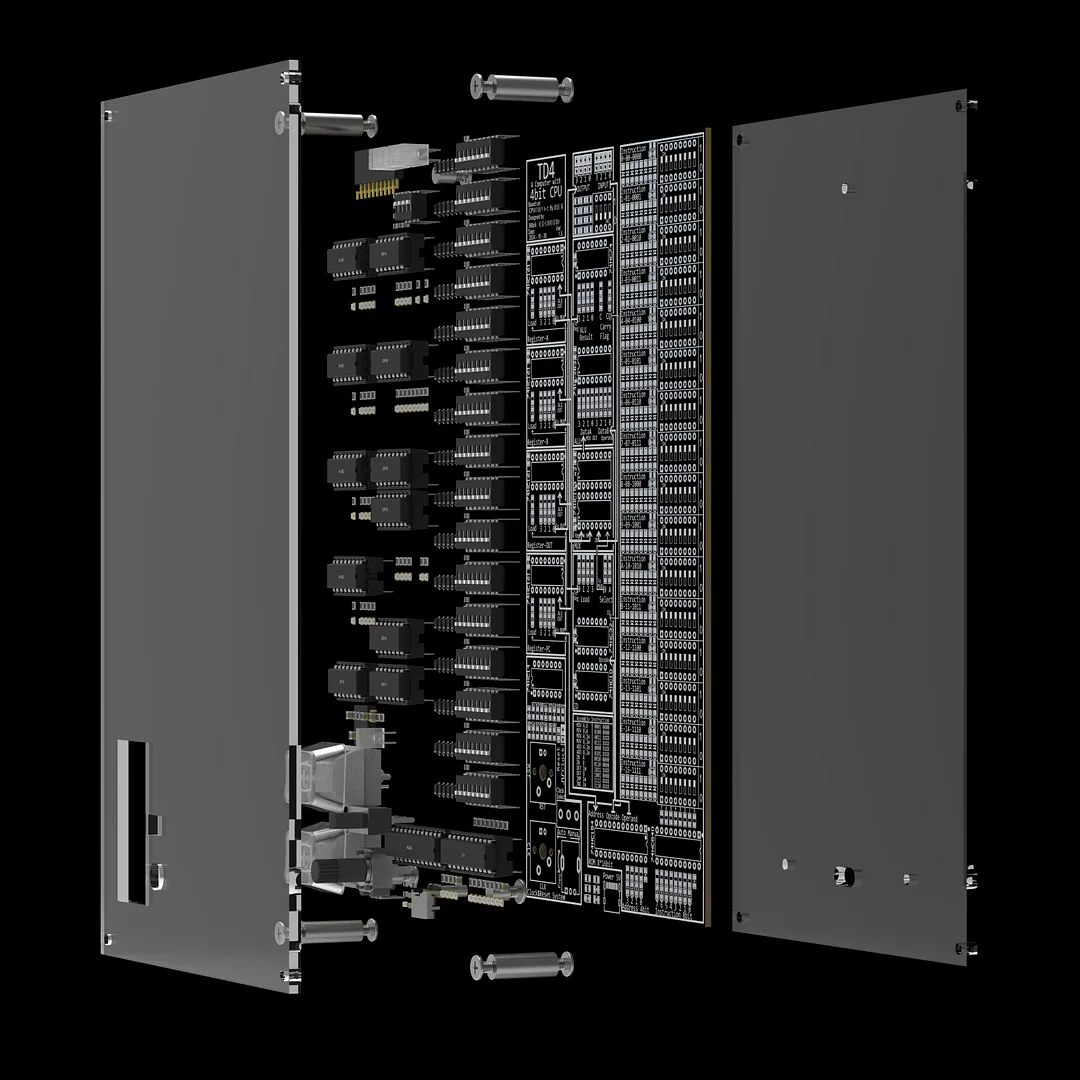 This is a computer composed of 74 series digital circuit chips, which meets the five basic components of computers proposed by von Neumann, including arithmetic unit, memory, input device, output device and controller. Its core is a 4-bit CPU composed of 10 74 chips, including ALU (arithmetic logic unit), ID (instruction decoder), MUX (data selector), PC (program counter), and registers A, B and output registers.