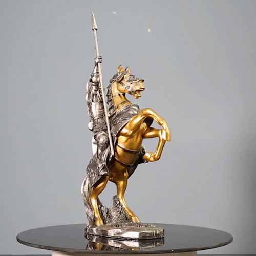 The warrior is depicted in a dynamic and powerful stance, symbolizing strength and bravery. This piece is likely made of high-quality materials such as brass, bronze, or stone and can be used to add a touch of medieval charm to a home or office. It can serve as a conversation starter, inspiring thoughts of bravery, history, and the chivalry of ancient knights.